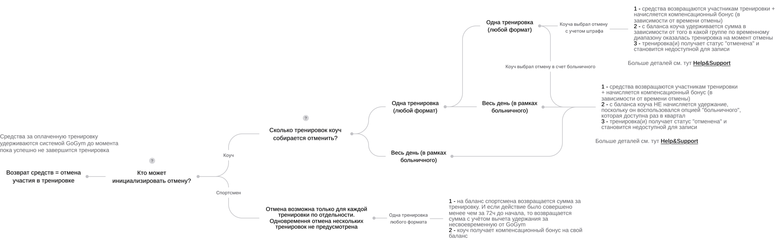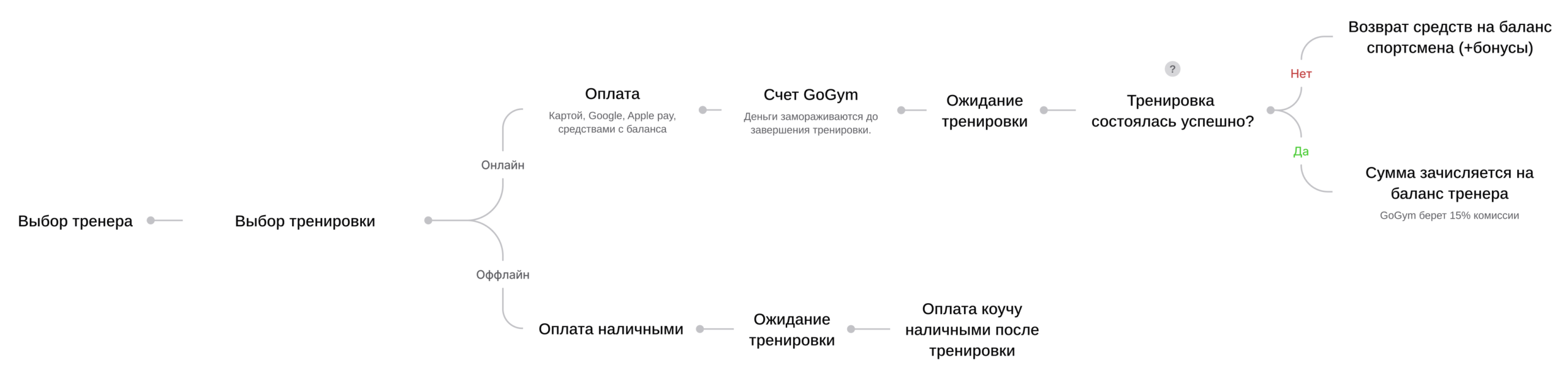 • Все расчёты и возвраты по безналичным оплатам осуществляются через систему GoGym. В случае наличной оплаты тренировки возврат регулируется индивидуально — напрямую между коучем и пользователем;
